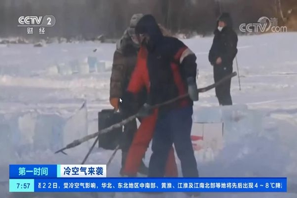 黑龍江漠河:寒冬時節(jié) 河面采冰忙