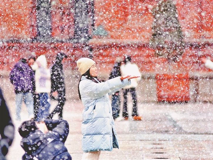 雪花飄飛 游客興致更濃