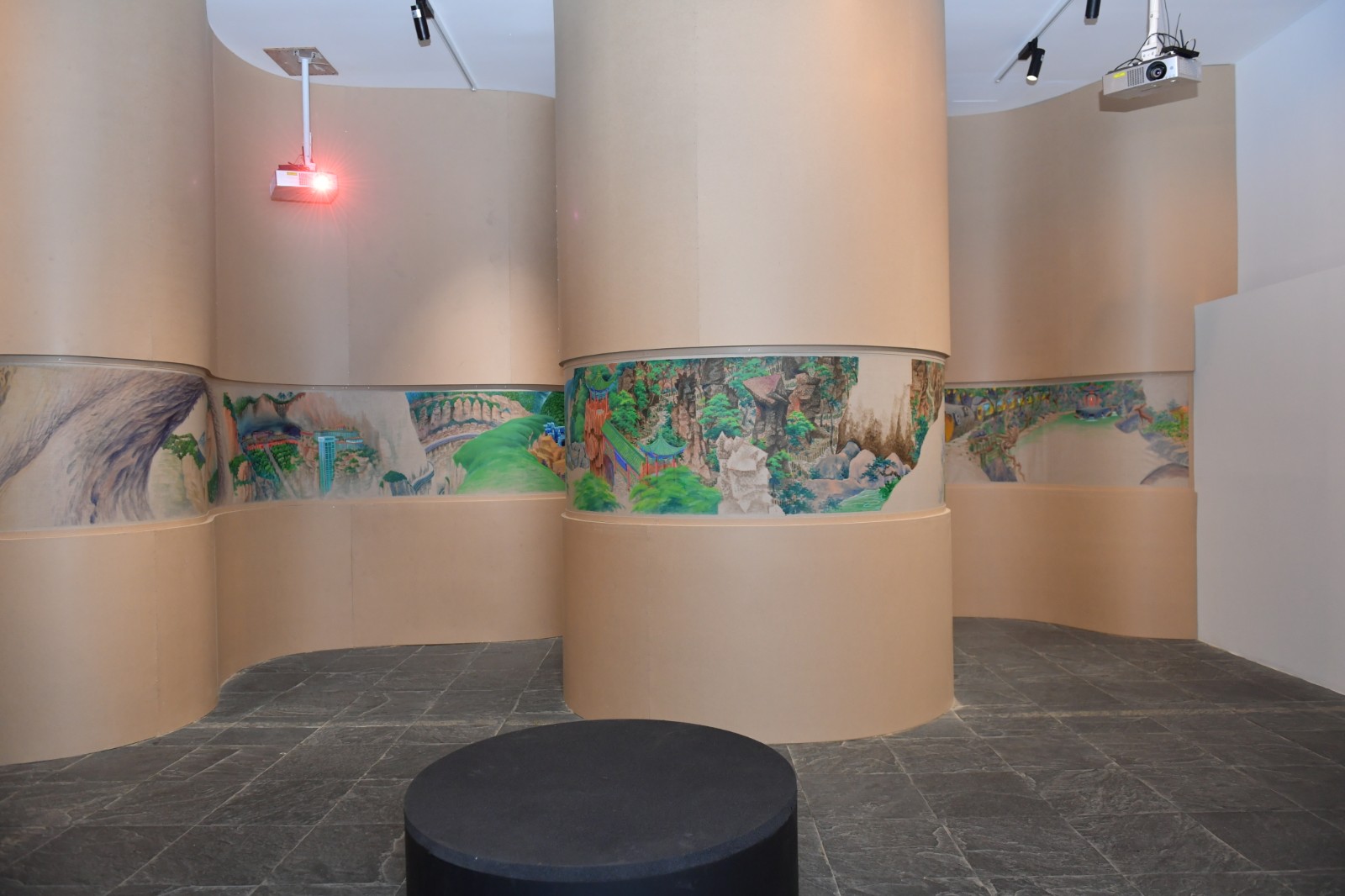 “地洞”一旁是展廳的下沉區(qū)域,這里被策展人設(shè)計為去往“桃花源”的實體路徑。梁碩的《景了個區(qū)》出現(xiàn)在這個下沉空間的一排四個口袋式的連續(xù)隔間墻面上,從空間上來說是無比契合的?;仡櫫捍T2019年在北京公社的展覽《梁碩:景區(qū)》同樣可以見到這樣一種迂回的觀展路徑。“景區(qū)”這個概念的提出,在藝術(shù)家看來代表著今天人們對山水的理解,這個獨特的概念跨越了自然景觀與都市空間。梁碩在自己撰文的《景了個區(qū)》中復(fù)原了一個景區(qū)籌備建立起來的小故事,承包景區(qū)改造的劉工在工期接近尾聲時,看到自己的“杰作”時不由感嘆:“這些水泥造物,居然都妥妥的在那了,像是本來就是從山里長出來的,那巨大的假山石和假樹根顯得造型怪異,卻頗得陳老蓮氣韻,在落日的余暉中與真山融為一體,真山也像了假山……”[6]景區(qū)的建立勢必意味著人工、商業(yè)、消費對自然景觀的直接侵入與改造,空間、審美、意識形態(tài)等一系列問題由此發(fā)生。