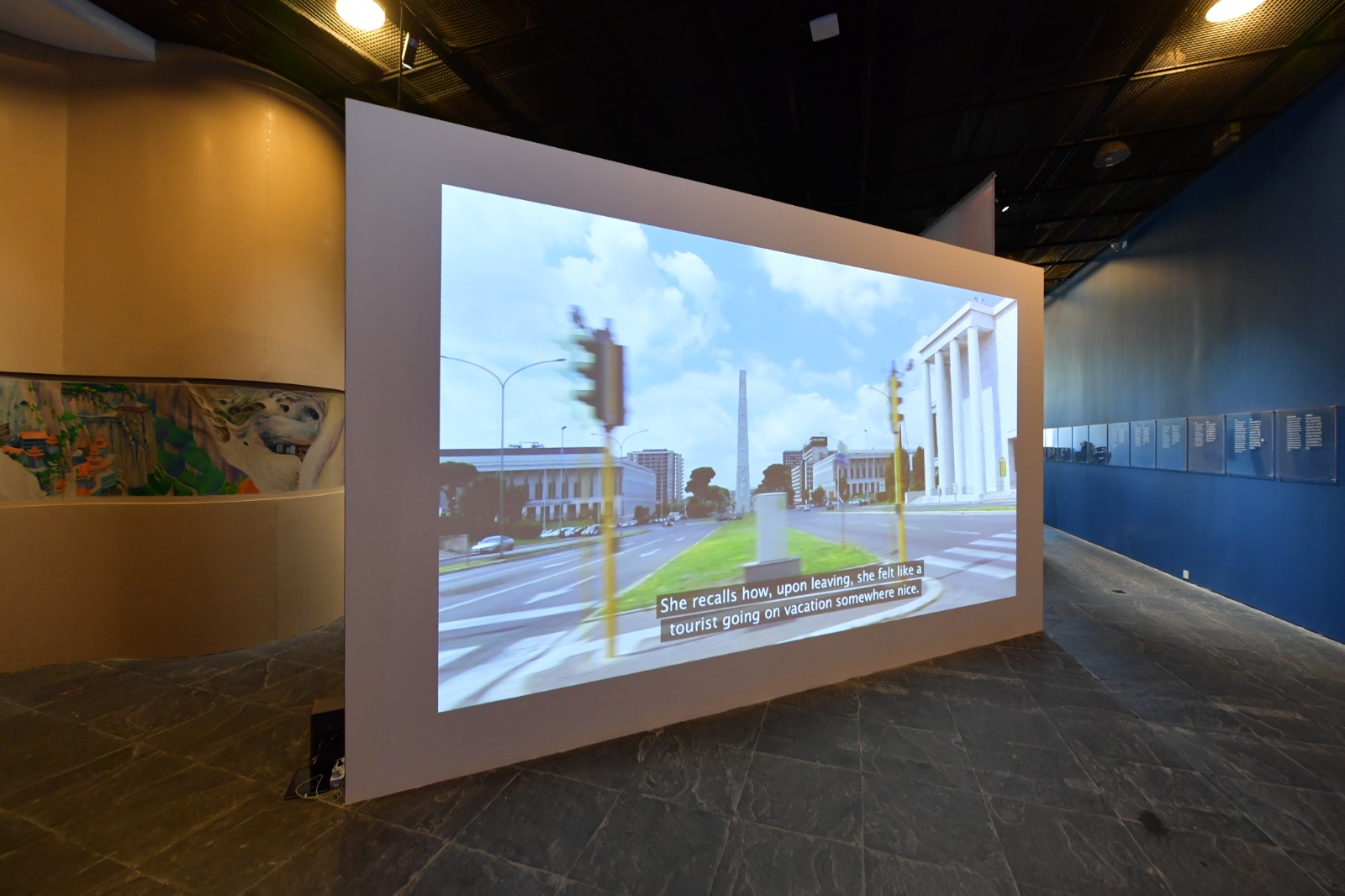 梅·海瑟格(Maj Hasager)《我們將在盲點相遇》是展覽呈現(xiàn)的最后一件作品,其講述了關(guān)于羅馬新城EUR區(qū)(Esposizione Universale di Roma)里的菲律賓移民的故事。這座由墨索里尼親自監(jiān)督設(shè)計的,以法西斯美學(xué)構(gòu)想出來的烏托邦城市,直至1960年才建成并被逐步被開發(fā)為羅馬新的富人區(qū)。海瑟格把眾多意大利導(dǎo)演在EUR區(qū)攝制的紀(jì)錄片、電影所刻畫的城市公共記憶,與這群定期在市中心一座教堂的地下室聚會的移民社群一同放入她的影像作品中,影像記錄了這個群體的閑暇時光,以一種個人的、私密的視角探索了菲律賓移民的私人記憶與生活如何融入并生存于這座有著強(qiáng)大歷史記憶的城市之中。正如約翰·伯格(John Berger)在《第七人》中的論述:“兩群不同的人在任何情況下,永遠(yuǎn)都是共性大于差異性的。只是由于種種原因,環(huán)境蒙蔽了人們的眼睛?!盵7]我們看得見的是歷史的記憶碾壓而過留下的軋痕以及其帶來的城市變遷,而看不見的是居于其中的人是如何在此種變遷中安放自我的記憶與故事。從這個立意來看,展覽所討論的議題似乎又回溯到了“公共”與“私人”,“歷史”與“記憶”之間的連接,然而涉及的場域已經(jīng)擴(kuò)展到了一個城市或是一種文化以外。