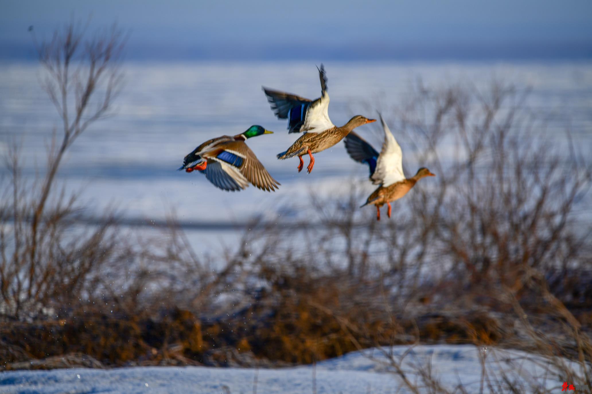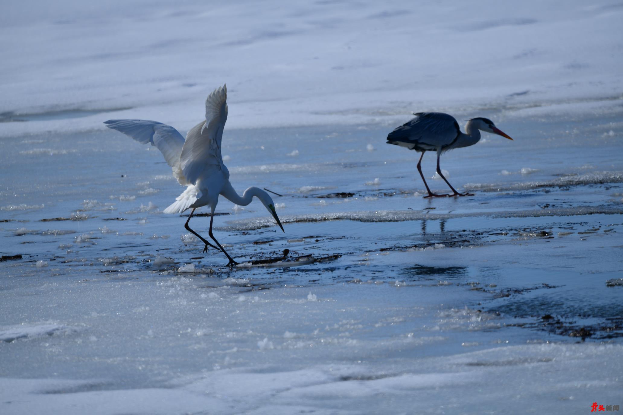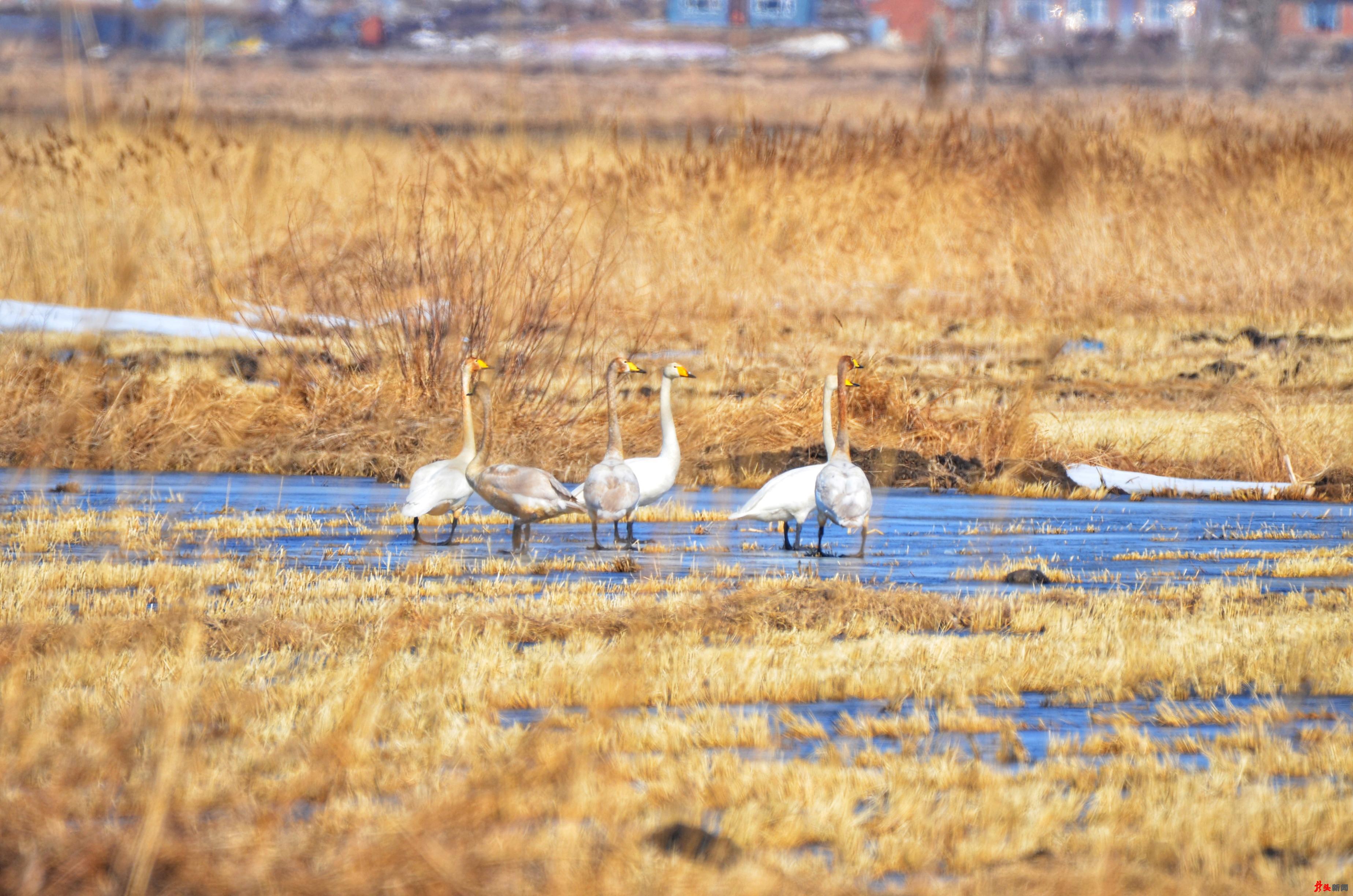 候鳥(niǎo)們有的聚集在剛剛化凍的湖邊,有的聚集在興凱湖閘門(mén)流水口附近的活水中,更多的則群集在興凱湖附近的水田地或沼澤地里。