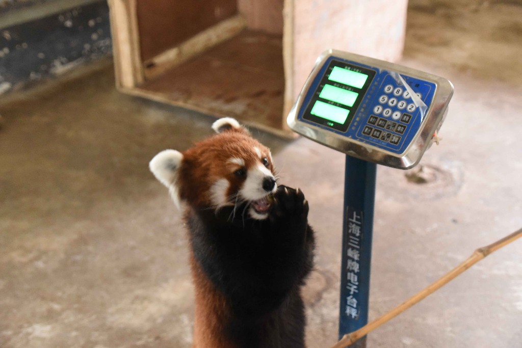 小熊貓對稱體重、量身高體長等體檢項目十分喜愛。因為飼養(yǎng)員們會用美食吸引它們走上體重秤,并在秤上直立身體量身高。小熊貓“小豆包”體檢時會展現出聰明又粘人的本性,抱住秤不撒爪,撒嬌賣萌很是可愛。