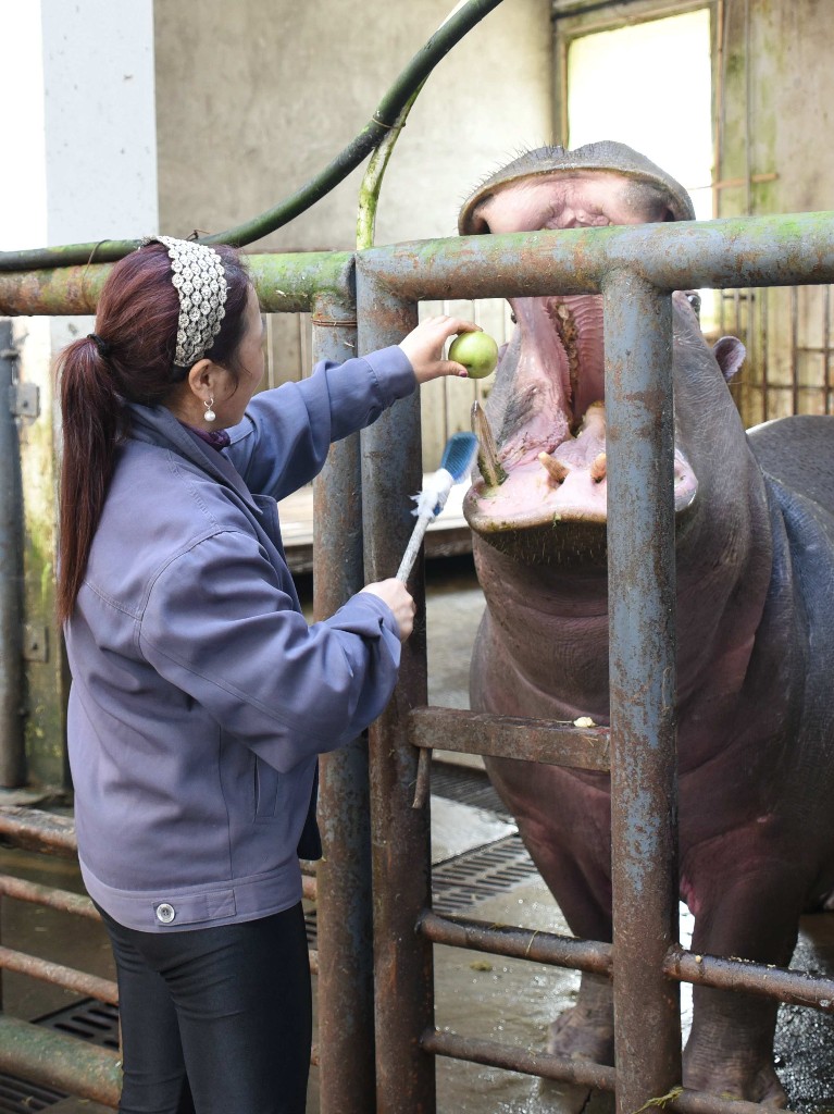 對于成年河馬除了身高體重測量,還要多加一項口腔檢查??纯茨菑堦懮溉閯游镏凶畲蟮淖炖铮谇?、牙齒是否健康。為更好觀察細節(jié)會先給河馬刷牙,河馬們對這種健康又舒適的特殊服務十分歡迎。