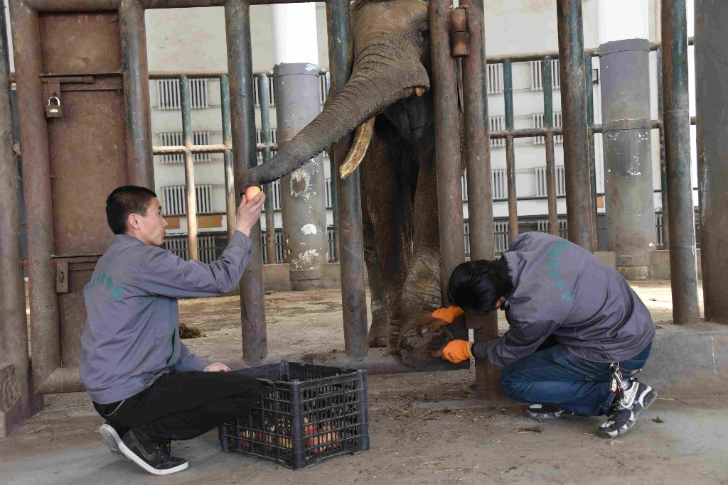 非洲象“豆豆”今年11歲,還在長身體。這次體檢發(fā)現,一個冬天“豆豆”個子長了6cm,體重長了150kg,牙齒長長,腿長粗,腳也長大了。更讓“豆豆”喜歡的是,量完腳還有專業(yè)的修腳服務。
