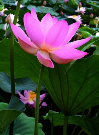 荷花凋謝前,花中心蕊開始長蓮蓬。秋天花瓣脫落,便留下蓮蓬,形狀似漏斗。蓬內(nèi)長著蓮子,成熟后顆顆飽滿凸起。荷梗是一枝中空管狀長梗,其外表生毛刺。荷花、荷蓋、蓮蓬都長在梗的頂端,夏天干挺,秋后干扁,并會曲折而斷。尖葉是葉蓋的初長之葉,兩頭尖,卷曲成筒形,梗短而細(xì)小,很優(yōu)美。