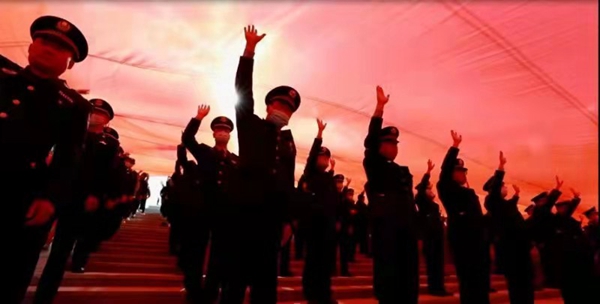 伴隨著激昂的樂曲,一面400平方米的巨幅黨旗緩緩展開,面向鮮紅的黨旗,在場的黨員干部和居民群眾心潮澎湃。100名黨員整齊列隊,在領誓人的帶領下舉起右拳,莊嚴宣誓,重溫入黨誓詞,回望入黨初心,抒發(fā)對黨忠誠的意志和信念。