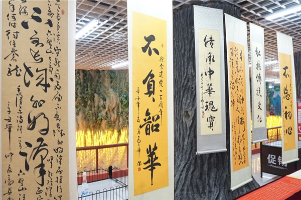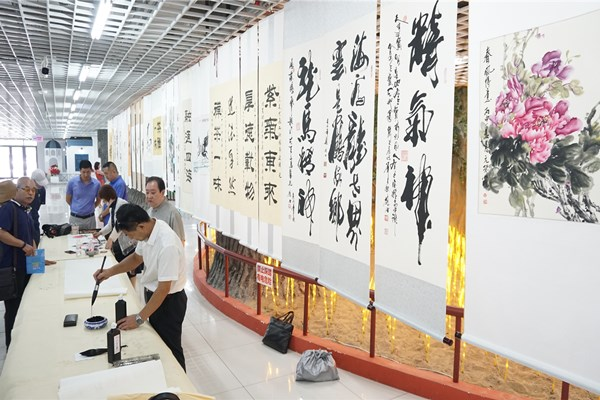 挽袖、研墨、調(diào)色、揮毫,書畫家們進(jìn)行現(xiàn)場書畫創(chuàng)作并交流創(chuàng)作心得。以書言志、以畫寄情,一幅幅極富感染力的書法、繪畫作品,抒發(fā)了對黨的敬愛之情和對祖國的美好祝愿?;顒蝇F(xiàn)場共展出書畫作品百余件。