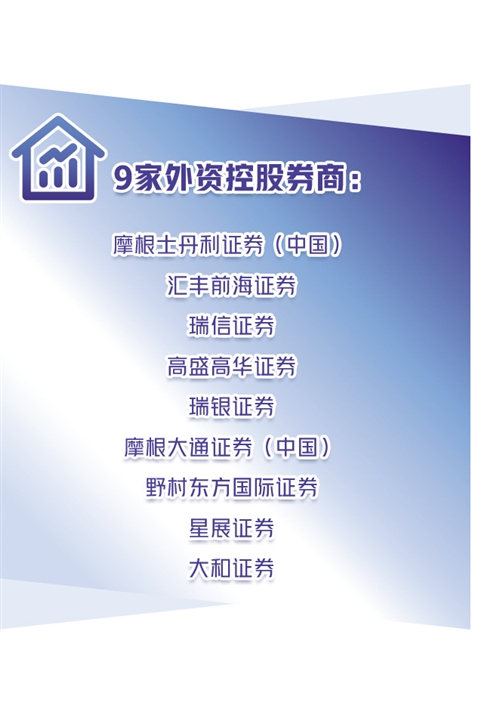 截至目前,外資控股券商已達到9家,分別為摩根士丹利證券(中國)、匯豐前海證券、瑞信證券、高盛高華證券、瑞銀證券、摩根大通證券(中國)、野村東方國際證券、星展證券和大和證券。