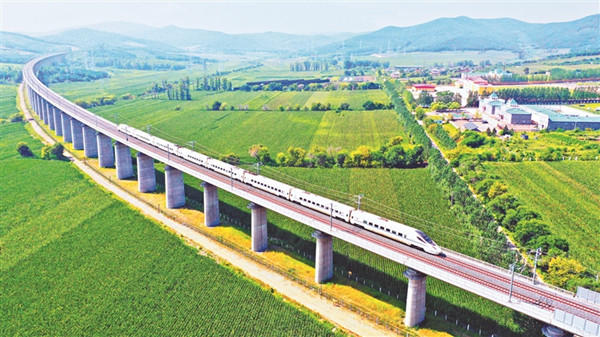 牡佳高鐵試運行列車通過集賢縣小安邦河2號特大橋。