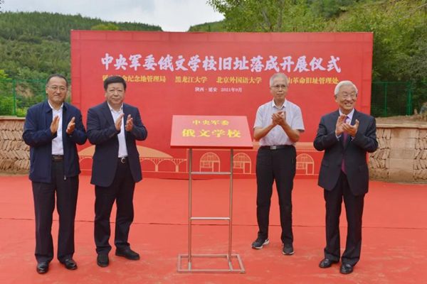 延安革命紀(jì)念地管理局黨委書記薛耀軍、黑龍江大學(xué)黨委書記王永清、北京外國語大學(xué)校友總會會長楊學(xué)義工、中央軍委俄文學(xué)校校長曾涌泉之子曾建為中央軍委俄文學(xué)校舊址展覽揭牌。
