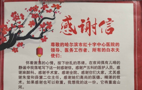 黑龍江經(jīng)濟(jì)網(wǎng)訊(孫麗霞 葉鴻 梁新立)“懷著激蕩的心情,按下紛亂的思緒,在夜間偶有兒啼的靜謐中我落筆寫下這一封感謝信……如果感謝也可以稱重,我想我的這一份,它將重逾山河。”近日,哈爾濱市紅十字中心醫(yī)院(哈爾濱醫(yī)科大學(xué)附屬哈爾濱婦產(chǎn)醫(yī)院)產(chǎn)五科收到了來自患者家屬李先生的一封感謝信和一面錦旗。