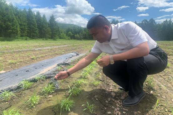 圖為關(guān)成國在古源林場興安雪菊種植基地查看雪菊長勢情況(魏樹強/攝)