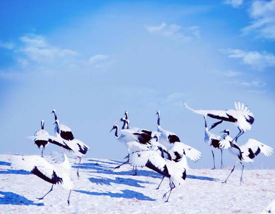 白雪映藍(lán)天,蘆葦泛金黃,期間點(diǎn)綴著數(shù)十只身著黑白羽衣丹頂鶴的扎龍生態(tài)旅游區(qū),讓游客猶如置身于童話世界。站在放飛平臺(tái)放眼望去,一群丹頂鶴或飄然起飛,或在雪地上翩翩起舞……這就是在齊齊哈爾扎龍生態(tài)旅游區(qū)的最美冬景,這就是扎龍雪地觀鶴。