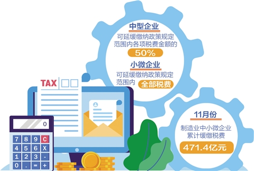 剛剛過去的11月是制造業(yè)中小微企業(yè)階段性稅收緩繳政策實(shí)施首月。12月1日,國(guó)家稅務(wù)總局發(fā)布統(tǒng)計(jì)數(shù)據(jù)顯示,這項(xiàng)政策實(shí)施效果顯著,制造業(yè)中小微企業(yè)已累計(jì)緩繳稅費(fèi)471.4億元。