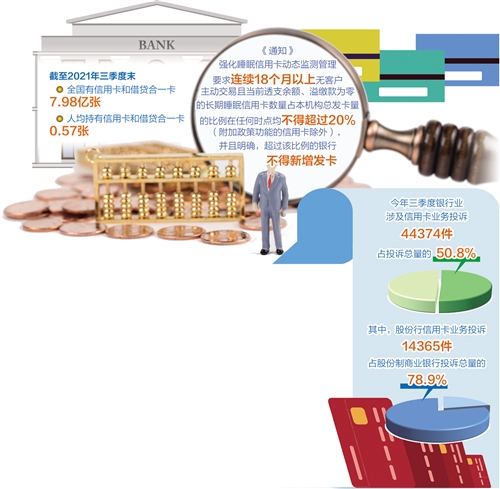 近年來,我國銀行業(yè)金融機構信用卡業(yè)務快速發(fā)展,在便利群眾支付和日常消費等方面發(fā)揮了重要作用。人民銀行發(fā)布的數(shù)據(jù)顯示,截至2021年三季度末,全國有信用卡和借貸合一卡7.98億張,人均持有信用卡和借貸合一卡0.57張。發(fā)卡量激增的同時,行業(yè)亂象也被各界詬病,尤其是消費者針對信用卡過度營銷、亂收費等問題的投訴量近年來居高不下。