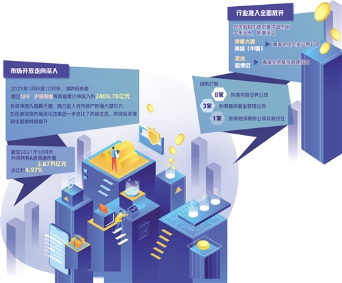 一系列開放舉措吸引了外資的高度關(guān)注和認可,外資參與中國市場熱情高漲,在華投資展業(yè)活動加快推進。截至2021年10月末,外資持有A股流通市值3.67萬億元,占比約4.97%。