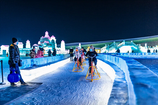今年園區(qū)的另一個(gè)“人氣王”,非單車城堡莫屬。單車城堡內(nèi)的冰上自行車項(xiàng)目,每天都吸引著大量游客騎行體驗(yàn)。在冰面上掌控方向不是件容易事,騎著冰上自行車,穿行于美麗的冰城堡中,對(duì)游客來說是一種前所未有的奇妙體驗(yàn)。