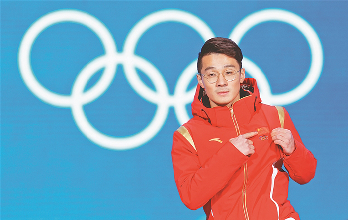 2月8日,冠軍中國隊(duì)選手任子威出席獎牌頒發(fā)儀式。當(dāng)日,北京2022年冬奧會短道速滑男子1000米獎牌頒發(fā)儀式在北京賽區(qū)頒獎廣場舉行。新華社發(fā)
