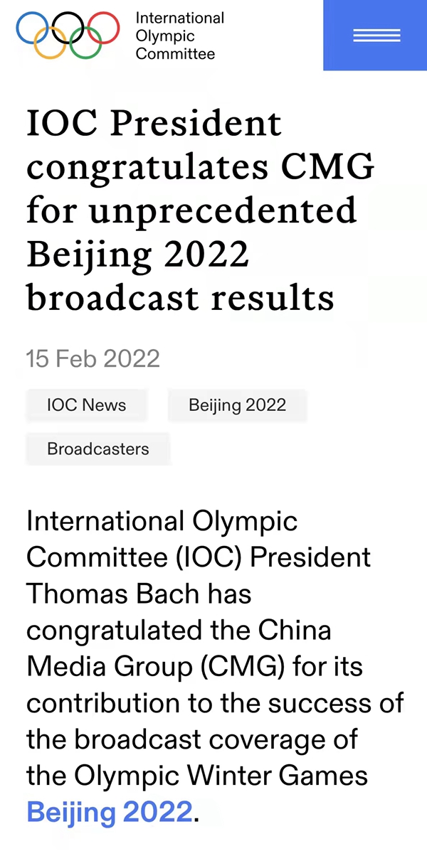 據國際奧委會官方網站2月15日消息:國際奧委會主席托馬斯·巴赫對中央廣播電視總臺為成功轉播報道2022年北京冬奧會所做出的貢獻表示祝賀。
