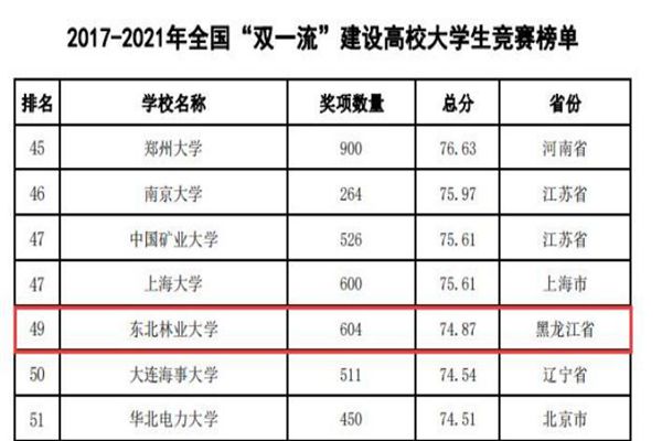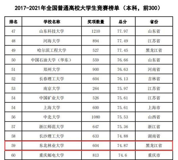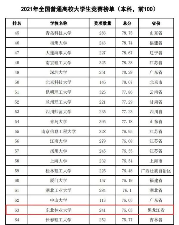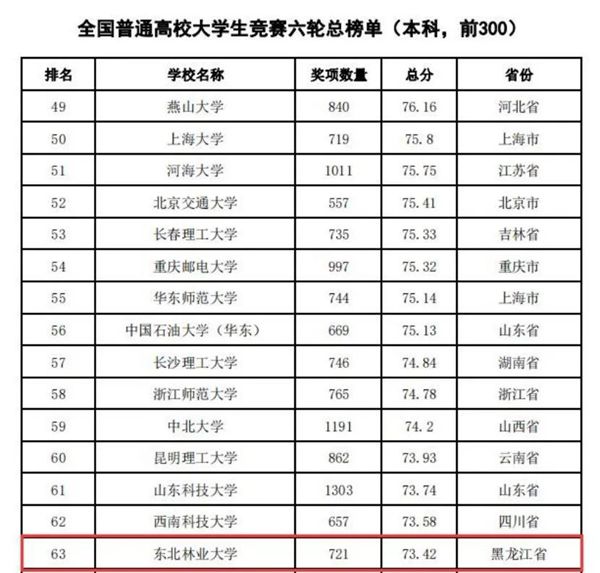 據(jù)悉,中國高等教育學會自2017年2月啟動《高校競賽評估與管理體系研究》項目以來,中國高等教育學會已經連續(xù)發(fā)布六輪榜單,這是我國第一個專注高校創(chuàng)新人才培養(yǎng)暨學科競賽成果的排行榜,是檢驗高校人才培養(yǎng)質量的重要途徑。為從更長的時間段了解各高校大學生競賽發(fā)展態(tài)勢,特在今年發(fā)布了“六輪總榜單”,時間跨度從2012年到2021年,東北林業(yè)大學以總分73.42,位列全國第63位。