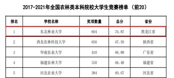 黑龍江經濟網(wǎng)訊(黑龍江日報全媒體見習記者董廣碩 商祺)近日,中國高等教育學會高校競賽評估與管理體系研究工作組發(fā)布2021全國普通高校大學生競賽分析報告,在《2017-2021年農林類本科院校大學生競賽排行榜TOP20》中。東北林業(yè)大學以總分74.87(獲獎604項)的優(yōu)異成績連續(xù)四年蟬聯(lián)榜首。