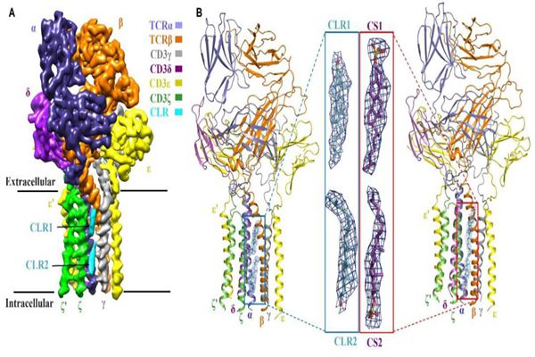 T細(xì)胞是脊椎動物適應(yīng)性免疫的重要細(xì)胞,在病毒感染、癌癥以及自體免疫疾病中起著關(guān)鍵作用。T細(xì)胞通過其TCR-CD3受體復(fù)合物特異性識別抗原,將胞外的抗原識別信號跨膜傳遞到T細(xì)胞內(nèi),激活胞內(nèi)的適應(yīng)性免疫信號通路,啟動免疫反應(yīng)。2019年,該課題組在《自然》(Nature)上發(fā)表了題為“人T細(xì)胞受體-共受體復(fù)合物組裝的結(jié)構(gòu)基礎(chǔ)”(Structural basis of assembly of the human TCR-CD3 complex)的研究文章,首次解析了人T細(xì)胞受體復(fù)合物(包含全部8個亞基)的高分辨率冷凍電鏡結(jié)構(gòu),揭示了TCR-CD3亞基在膜外側(cè)以及膜內(nèi)識別、組裝成功能復(fù)合物的分子機制。但一直以來,T細(xì)胞受體如何將胞外抗原信號傳遞到胞內(nèi)激活T細(xì)胞的這一關(guān)鍵機制的結(jié)構(gòu)基礎(chǔ)并不清楚。