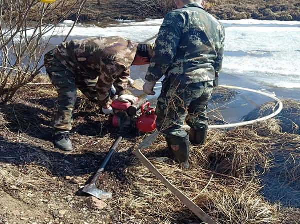 加格達奇林業(yè)局組織工作人員利用水泵抽水助融(趙子敬 攝)