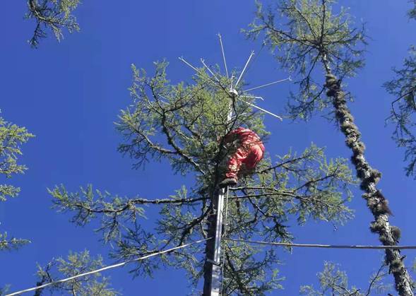 呼中林業(yè)局工作人員依附樹木進(jìn)行“拒雷”設(shè)備安裝(徐志偉攝)
