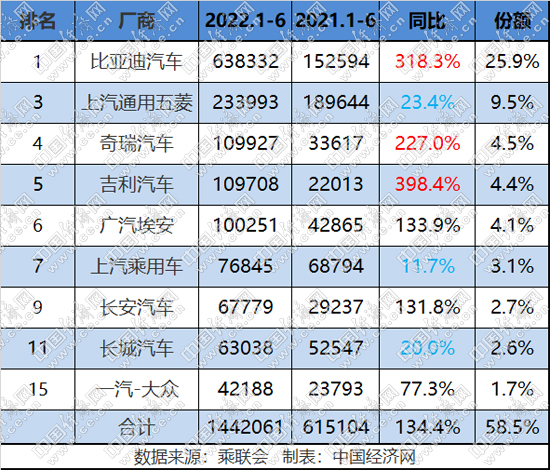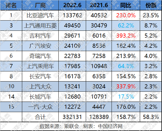 在乘聯(lián)會發(fā)布的6月新能源乘用車批發(fā)銷量廠商排名(TOP15)中,傳統(tǒng)品牌占據(jù)10席,共計銷售33.2萬輛,同比增長158.7%,市場份額接近六成,達(dá)到58.3%,1-6月,傳統(tǒng)品牌新能源累計銷售144.2萬輛,同比增長134.4%,份額同樣接近六成,為58.5%。