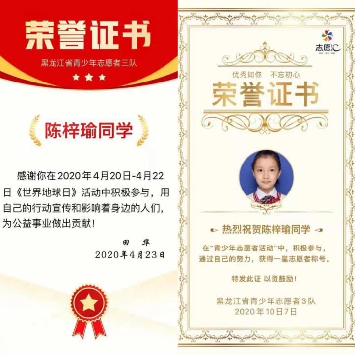 陳梓瑜同學(xué)熱衷于志愿服務(wù)活動。連續(xù)三期參與了為貧困小學(xué)捐書志愿活動、“美化井蓋·建文明城市”系列志愿服務(wù)、積極參與“雛雁計(jì)劃助學(xué)活動”,她積極組織策劃了 “小小圖書管理員·你我共建”志愿活動、“垃圾分類小衛(wèi)士”志愿活動、幫助哈爾濱市公安局推廣“防詐騙軟件志愿活動”。