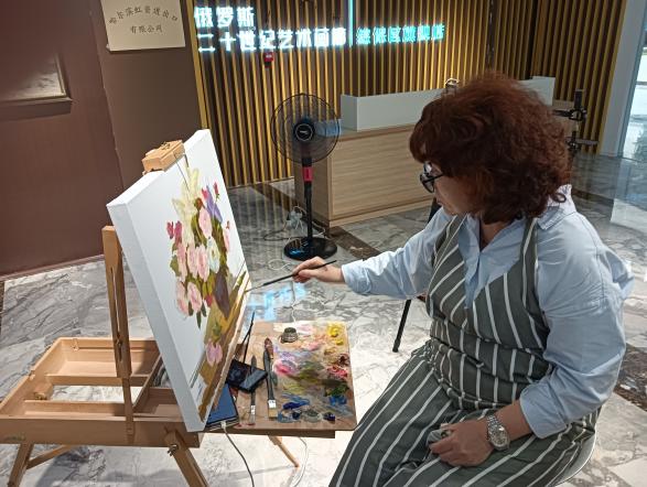 活動(dòng)期間,柯切爾金娜·伊麗娜到哈爾濱綜合保稅區(qū)參觀俄羅斯文化展示館(俄中藝術(shù)線下商城體驗(yàn)店No.1),與哈爾濱綜合保稅區(qū)領(lǐng)導(dǎo)就中俄優(yōu)秀傳統(tǒng)文化進(jìn)行了友好交流,并即興在展館內(nèi)現(xiàn)場(chǎng)作畫。伊麗娜以繪畫花卉靜物著名,曾榮獲俄羅斯文化部獎(jiǎng)狀、俄羅斯文化部榮譽(yù)證書、俄羅斯美協(xié)銀質(zhì)獎(jiǎng)?wù)隆?
