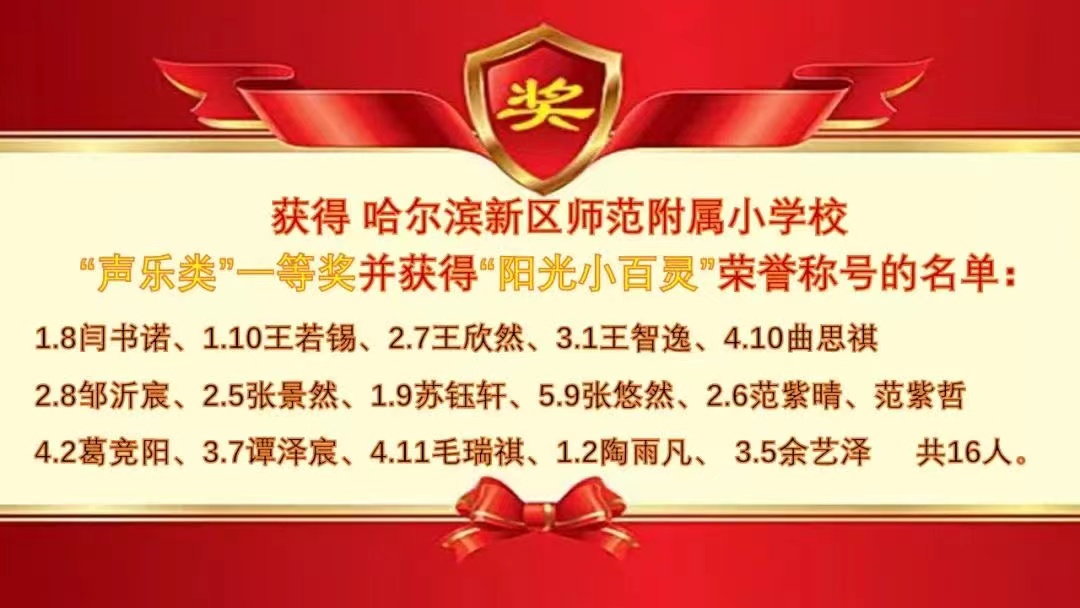 諾同學(xué)的班主任馬男老師很重視孩子們的全面發(fā)展,鼓勵(lì)孩子們積極參加各種文體活動(dòng)。在馬老師的積極引導(dǎo)下,閆書諾同學(xué)在學(xué)校藝術(shù)節(jié)的聲樂比賽中,以一曲《童心向黨》喜獲“聲樂類”一等獎(jiǎng)和“陽(yáng)光小百靈”榮譽(yù)稱號(hào)。