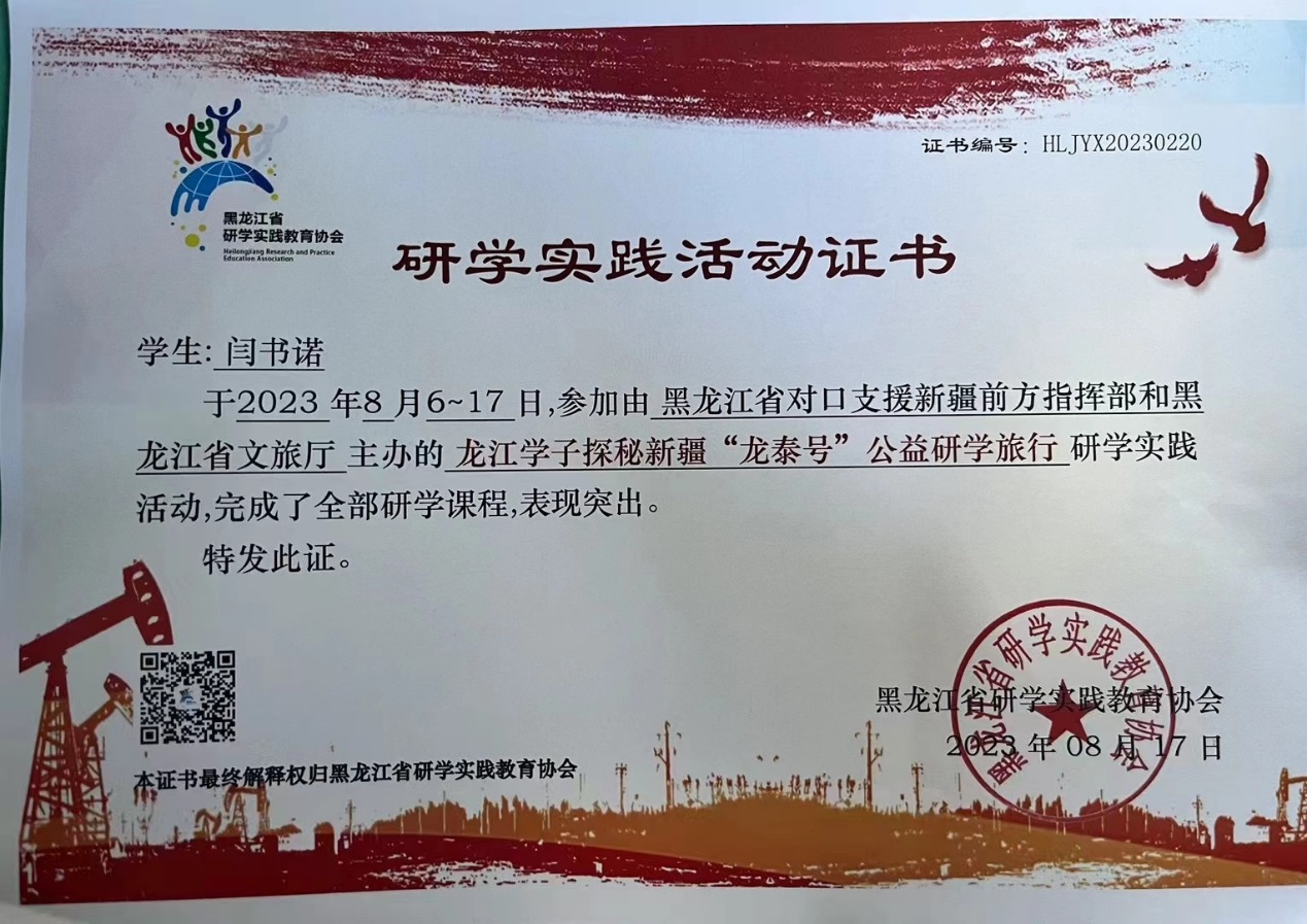 在今年8月,報(bào)名參加了黑龍江省對(duì)口支援新疆前方指揮部和黑龍江省文旅廳主辦的“探秘新疆公益研學(xué)旅行”,到可可托海紅色教育基地實(shí)地參觀“三號(hào)礦坑”,緬懷那些為國(guó)家奉獻(xiàn)出生命的前輩。