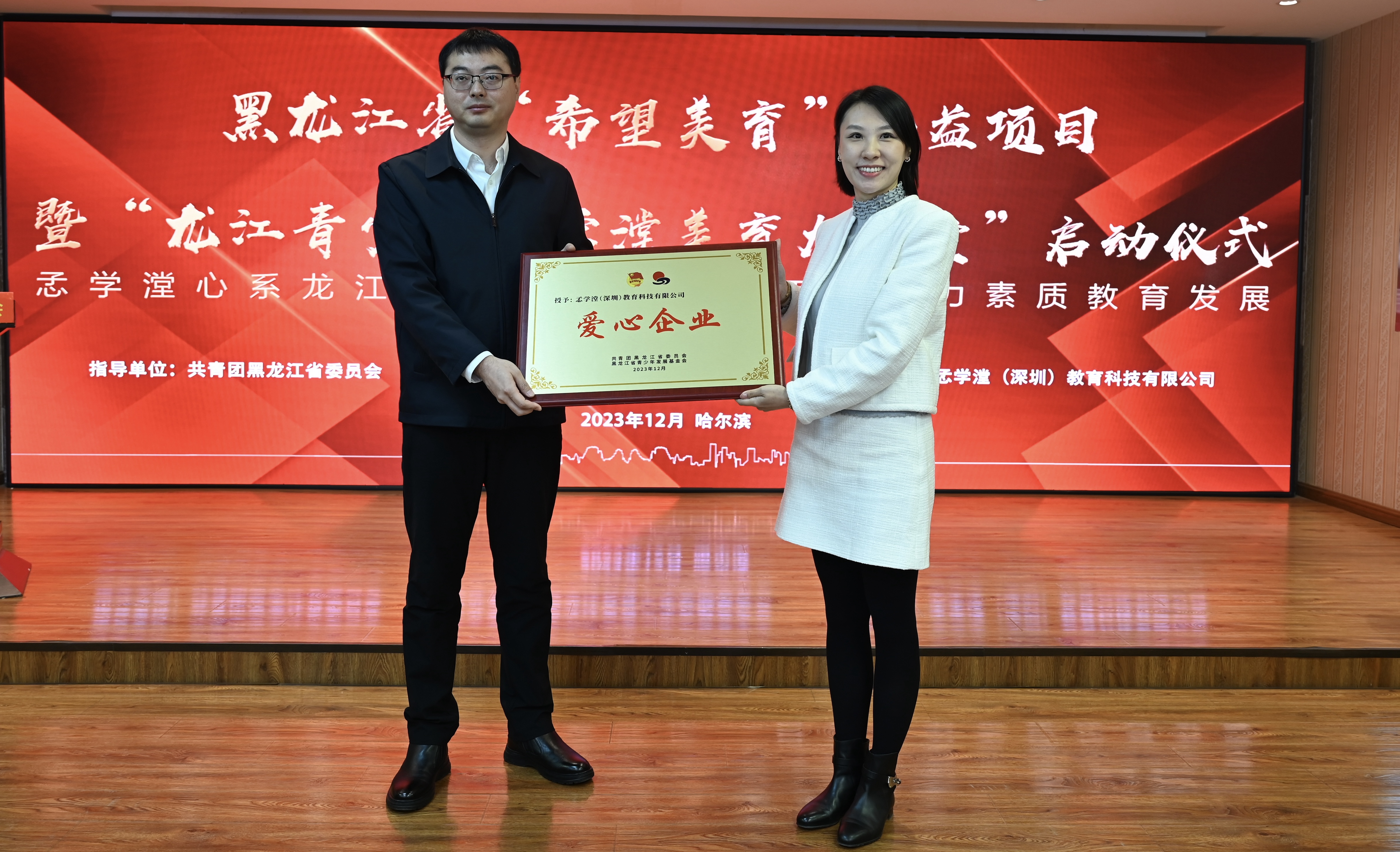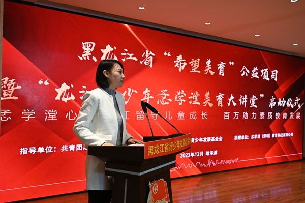 為深入貫徹習(xí)近平總書記對希望工程實施30周年的重要寄語精神,進一步提升新時代希望工程的助學(xué)育人質(zhì)量,12月12日,黑龍江省“希望美育”公益項目暨“龍江青少年孞學(xué)漟美育大講堂”啟動儀式在希望大廈舉行。黑龍江省文學(xué)藝術(shù)界聯(lián)合會一級巡視員張正明,共青團黑龍江省委副書記代東力,黑龍江省青聯(lián)委員、深圳市孞學(xué)漟教育科技有限公司創(chuàng)始人楊梓杺,黑龍江省民政廳、黑龍江省青少年發(fā)展基金會等相關(guān)單位領(lǐng)導(dǎo),嘉仁公益、益家公益代表,伙伴計劃社區(qū)代表,哈爾濱市松北區(qū)樂業(yè)小學(xué)“童心港灣”代表,哈爾濱市蘇寧紅軍小學(xué)校、哈爾濱市合眾人壽希望小學(xué)、哈爾濱新區(qū)第三學(xué)校等學(xué)校師生代表參加活動。