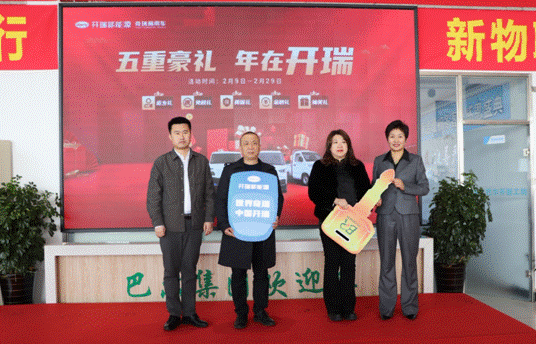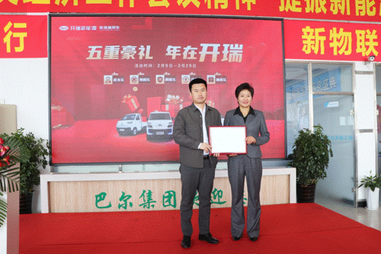開瑞新能源汽車有限公司北部戰(zhàn)區(qū)總監(jiān)王培山向巴爾新能源總經(jīng)理徐娟頒發(fā)省總代理授權(quán)書