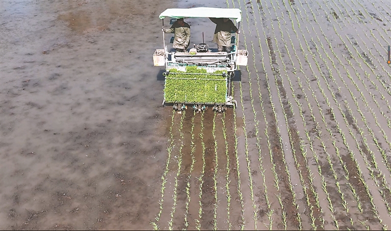 在樺南縣域內(nèi)的曙光農(nóng)場有限公司第三管理區(qū)水稻基地,種植戶們正忙著搬運秧苗。伴隨著轟鳴的機器聲,農(nóng)機手駕駛著裝配有北斗導(dǎo)航系統(tǒng)的高速插秧機開展作業(yè)。插秧機駛過之處,一株株秧苗從苗盤上依次滑落,均勻有序地插播在水田里。插秧機上,工人不時為插秧機補充秧苗,不一會兒,整片水田披上了綠裝,一行行整齊有序、間隔適中的秧苗在陽光下煥發(fā)著勃勃生機。