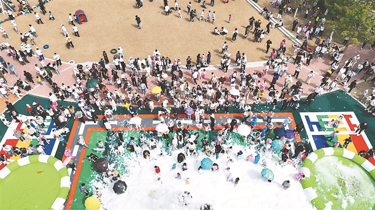 “彩虹泡泡派對”吸引眾多游客參與其中。本報記者 劉欣攝