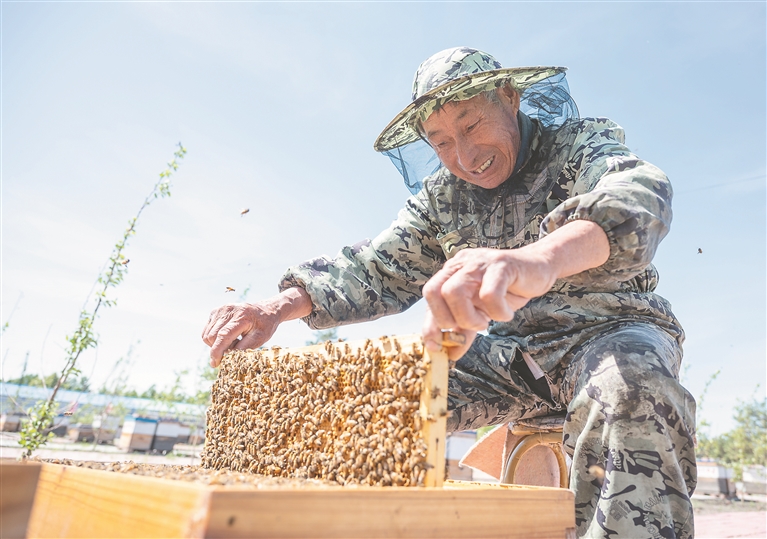 盛夏,草木蔥蘢、百花盛開,正是蜜蜂采蜜的好時節(jié)。走進齊齊哈爾市克東縣東興林場,上百箱規(guī)格統(tǒng)一的木質(zhì)蜂箱整齊排列,蜂箱周圍,勤勞的蜜蜂們正忙碌地搬運著甜蜜果實,發(fā)出嗡嗡的聲響。