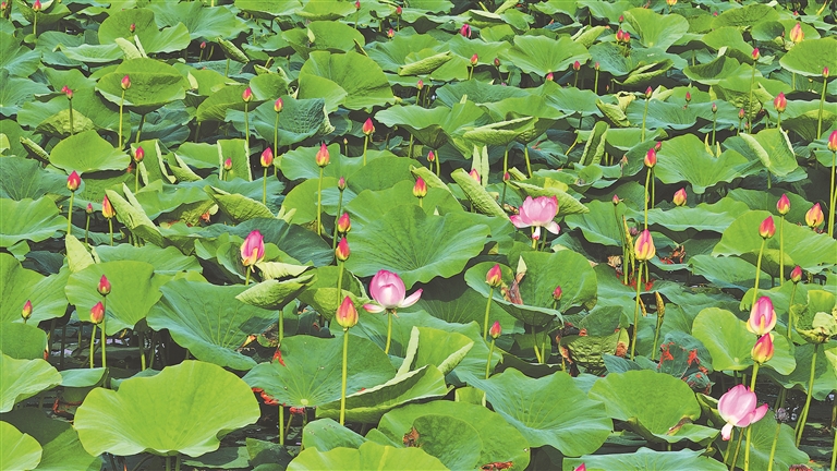 接天蓮葉無窮碧,映日荷花別樣紅。盛夏時節(jié),哈爾濱大劇院濕地里的荷花或含苞待放,或含羞盛開。粉色、白色的花瓣在荷葉間亭亭玉立隨風搖擺。