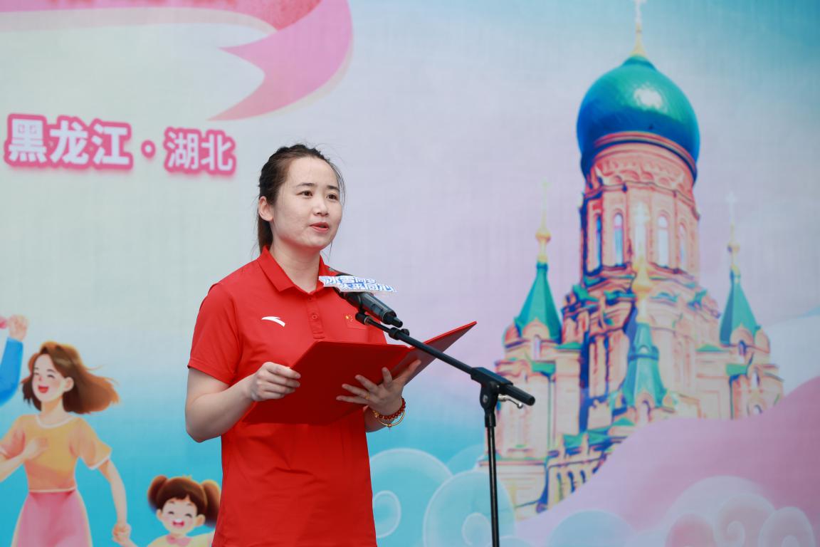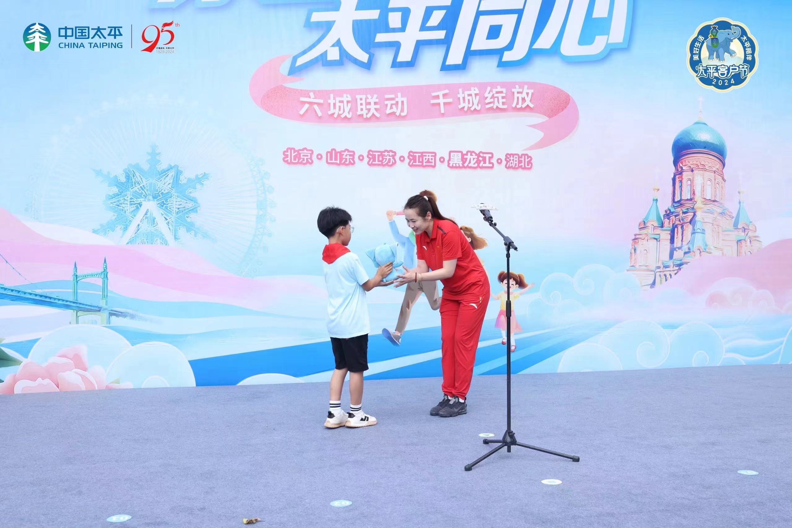 短道速滑世界冠軍孔雪進(jìn)行冠軍寄語(yǔ)??籽┍硎荆饺藟凼且患覟閲?guó)為民的企業(yè),與她為國(guó)爭(zhēng)光的目標(biāo)一致,作為一名6歲起就接觸滑冰的專業(yè)運(yùn)動(dòng)員,她曾經(jīng)經(jīng)歷了很多挫折與傷病,是為國(guó)爭(zhēng)光的使命感和給家人美好生活的信念推動(dòng)著她不斷前行。她用自身經(jīng)歷鼓勵(lì)小朋友要有為夢(mèng)想拼搏的勇氣,希望小朋友抓住每一次鍛煉的機(jī)會(huì),將運(yùn)動(dòng)精神傳遞下去。在孔雪的帶動(dòng)下,千余人共同喊出了“太平好少年,一起向未來(lái)”的口號(hào),響徹園區(qū)。