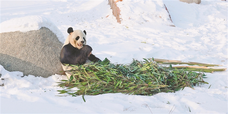 尤其是“佑佑”,曬著午后暖陽(yáng),坐在室外的雪地里,大口“狂炫”竹葉,這一口吃夠了,就尋覓著從雪里刨出來一根竹筍,秒變“剝筍小哥”?!坝佑印边€時(shí)不時(shí)停下來,盯著人群定格幾秒,仿佛是專門為游客拍照擺好姿勢(shì),令不少南方小伙伴感嘆“開了眼界”。