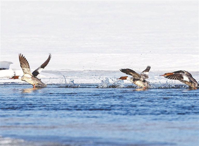 本報訊(黃曉光 記者郭俊峰)近日,國家一級保護(hù)動物秋沙鴨翩然而至,為小興安嶺的初春增添了別樣生機(jī)。它們在澄澈的水面上悠然游弋,時而將頭扎進(jìn)水里,探尋著水下的美味;時而歡快地拍打著翅膀,濺起晶瑩的水花。