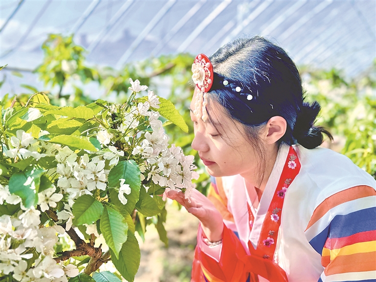 日前,湯原縣湯旺朝鮮族鄉(xiāng)大棚采摘園里櫻桃花大片盛開,吸引游客到此打卡拍照。據(jù)了解,該采摘園共有11棟大棚,種植1000余棵大櫻桃。櫻桃成熟后,果子個頭兒大,果肉厚實、硬度大,口感甜蜜,單體重量達到18克以上,年產(chǎn)量超7000斤,且耐儲存不易開裂,受到市場青睞。