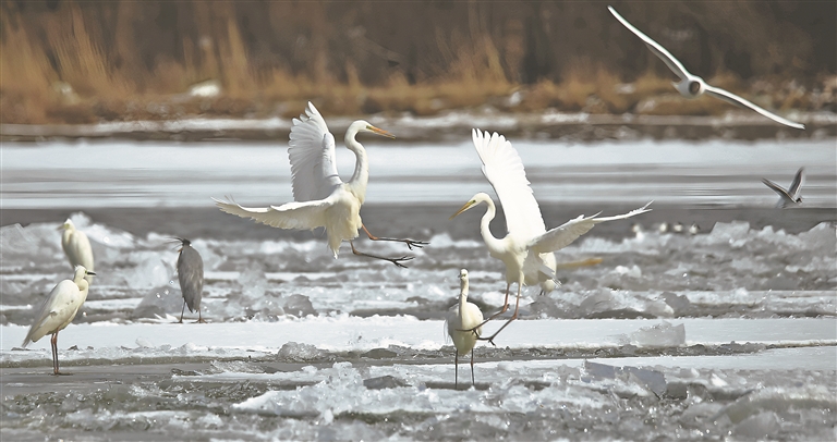 冰排流動(dòng),數(shù)百只鷺鳥羽翅翻飛,鳴聲陣陣,此時(shí)的松花江一派生機(jī)勃勃的景象。