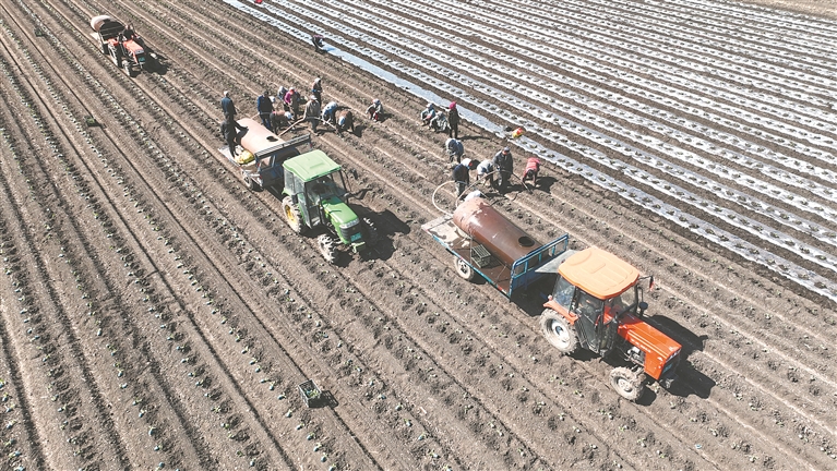 通往新華鄉(xiāng)的道路兩側(cè),儼然一幅動態(tài)的農(nóng)事畫卷:拖拉機(jī)“突突”作響,拉著水罐在田壟間穿梭;菜農(nóng)們分工默契,有人鋪設(shè)地膜,白色薄膜在黑土地上延展成浪;有人彎腰移栽,鮮嫩菜苗被小心植入土中;有人手持水管緊隨其后,清水汩汩滋潤著新苗。覆膜、栽苗、澆水,動作連貫流暢,田埂間回蕩著農(nóng)具與泥土的碰撞聲,交織成初夏最生動的勞作交響。