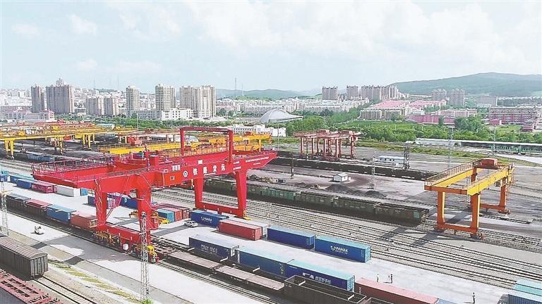 6日上午,百年口岸綏芬河鐵路車站換裝貨場(chǎng)內(nèi),塔吊在高效有序地對(duì)進(jìn)出境貨運(yùn)列車進(jìn)行著換裝作業(yè)。