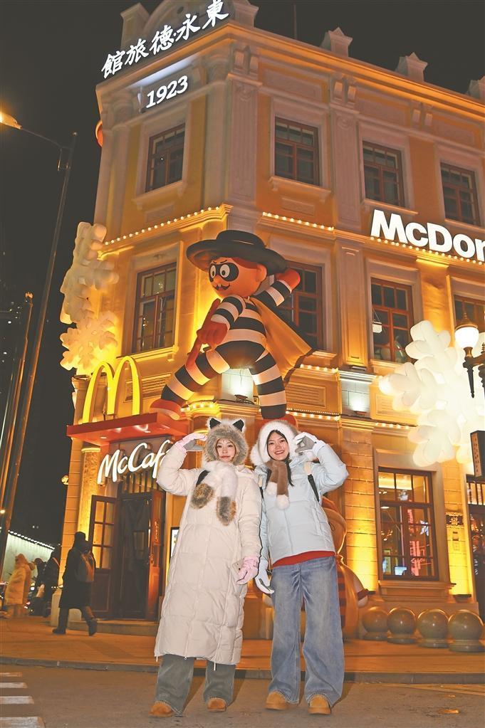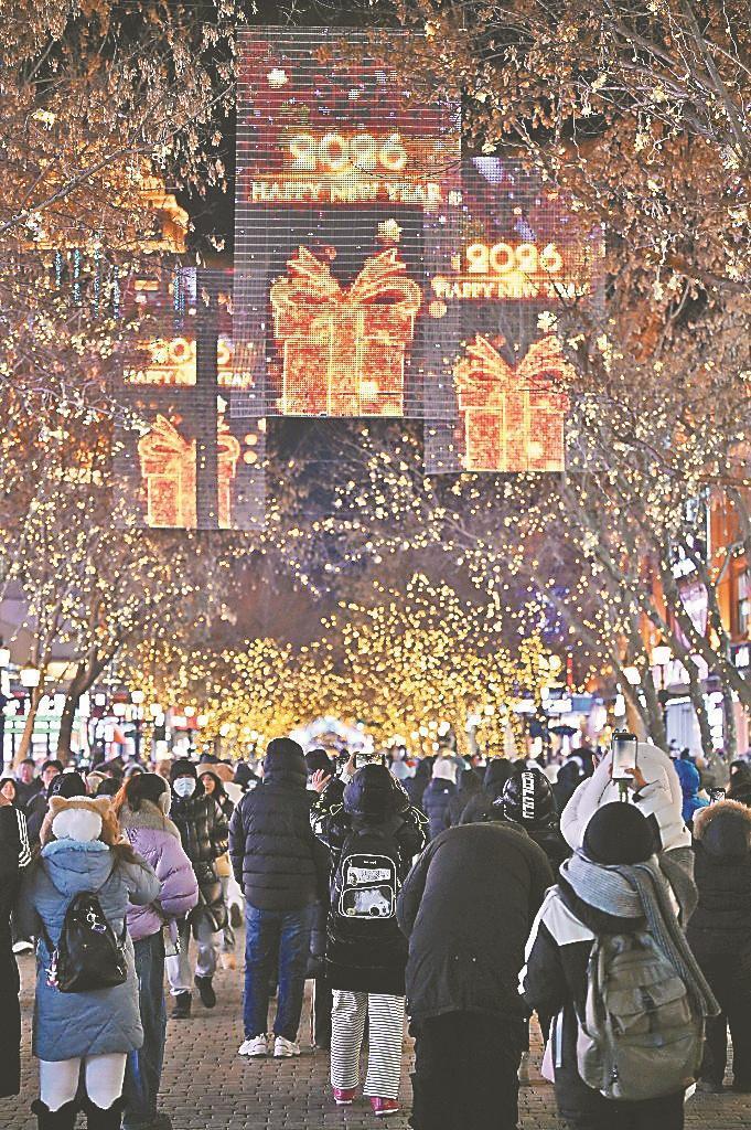 哈爾濱中央大街化身光影盛宴與煙火市集。以“瑞馬迎新”為主題的創(chuàng)意燈飾點(diǎn)亮了這條百年老街,動態(tài)飛馬踏星而行的造型靈動逼真,“馬上鴻運(yùn)”樹燈牌流光溢彩,與街區(qū)內(nèi)的歐式建筑輪廓交相輝映,勾勒出一幅夢幻的冬日夜景。面包石鋪就的街道上人潮涌動,來自五湖四海的人們肩并肩、手牽手,共赴這場跨年之約。