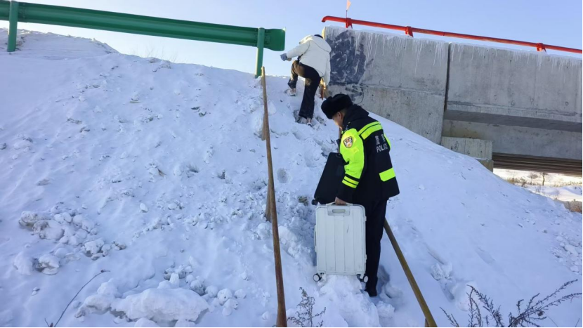 接警后,呼瑪縣公安局民輔警立即攜帶防滑鏈、鐵鏟、繩索等救援工具趕往現(xiàn)場。抵達現(xiàn)場后,民警第一時間查看被困人員安全并安撫游客情緒,發(fā)現(xiàn)駕駛員被主駕駛的玻璃劃傷后與游客迅速商量先“棄車就醫(yī)”。