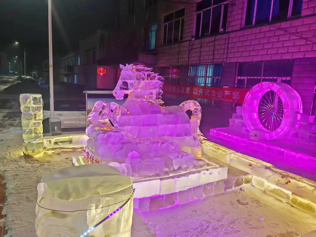 活動現(xiàn)場,專業(yè)技術(shù)工人憑借精湛技藝,專注勾勒駿馬整體輪廓,對眼部、鬃毛等關(guān)鍵部位精雕細琢,力求每一處細節(jié)都精準(zhǔn)靈動;林場干部職工則主動扛起取冰、補冰、轉(zhuǎn)運等“硬核”任務(wù),大家分工明確、默契配合,叮叮當(dāng)當(dāng)?shù)墓ぞ咔脫袈?、此起彼伏的互助吆喝聲,交織成冬日里最熱鬧的樂章。經(jīng)過十余天的奮戰(zhàn),一尊尊栩栩如生的冰雕驚艷亮相,并成為林場及周邊區(qū)域的“新春網(wǎng)紅地標(biāo)”,不少職工家屬、周邊群眾紛紛慕名而來,拍照打卡、定格年味瞬間,歡聲笑語為林場增添了更多溫馨氛圍。