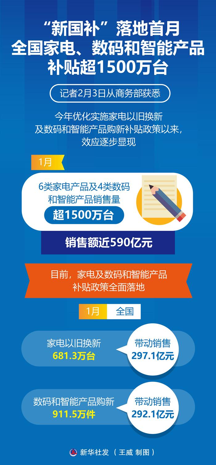 目前,家電及數(shù)碼和智能產(chǎn)品補(bǔ)貼政策全面落地。1月,全國(guó)家電以舊換新681.3萬(wàn)臺(tái),帶動(dòng)銷(xiāo)售297.1億元;數(shù)碼和智能產(chǎn)品購(gòu)新911.5萬(wàn)件,帶動(dòng)銷(xiāo)售292.1億元。